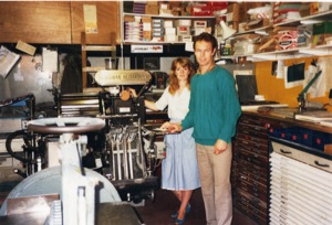 Alan and Sue in 1987 in Jetprint’s first home a small unit in Lealholm, just outside Whitby. You can see in the background a 1967 Heidelberg Letterpress which is still in used to this day for perforating and die-cutting.
